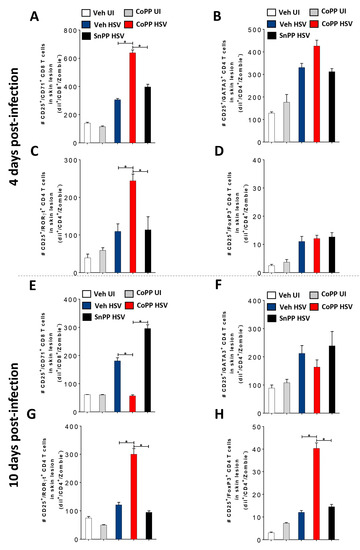 Phenotype and dynamics of virus-specific T cells infiltrating HSV-1-infected skin lesions after the transfer of HSV-infected DCs induced to express HO-1 and later HSV-1 infection. (A) Quantification of activated transgenic gBT-I virus-specific CD8+ T cells (CD25+/CD71+/Zombie- cells) tracked with the dye Dil (Dil+/CD8+) in skin lesions (1 cm2) at day 4 and day 10 (E) after HSV-1 KOS skin infection in C57BL/6J mice that were previously injected (2 days prior to infection) with transgenic virus-specific gBT-I CD8+ T cells together with transgenic virus-specific gDT-II CD4+ T cells, and then treated 24 h later with HSV-1-infected DCs treated with vehicle, CoPP, or SnPP (1 day prior to infection). (B) Quantification of activated virus-specific activated (CD25+/CD71+/Zombie-) gDT-II CD4+ T cells with a Th2 phenotype (GATA3+) tracked with the dye Dil (Dil+/CD4+) in skin lesions at day 4 and day 10 (F) after HSV-1 infection in mice treated similarly as in (A). (C) Quantification of activated transgenic virus-specific gDT-II CD4+ T cells with a Th17 phenotype (RORγt+) in skin lesions at day 4 and day 10 (G) after HSV-1 infection in mice treated similarly as in (A). (D) Quantification of activated transgenic virus-specific activated (CD25+/CD71+/Zombie-) gDT-II CD4+ T cells with a Treg phenotype (FoxP3+) in skin lesions at day 4 and day 10 (H) after HSV-1 infection in mice treated similarly as in (A). One-way ANOVA with Tukey’s multiple comparison test was used for statistical analyses (* p < 0.05). Data are means ± SEM (n = 5 mice/group for skin lesion determination).