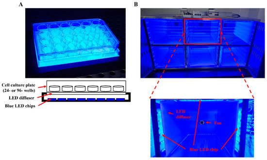 Illuminating devices to apply blue light irradiation to cells and animals. (A) Blue backlight for the in vitro experiments. The cell culture plate placed on the panel was irradiated by blue light through an acryl diffuser. (B) Animal housing cabinet manufactured with six animal rooms equipped with blue LED strips, a fan, and a light controller. An acrylic diffuser was placed inside each room with an animal cage.