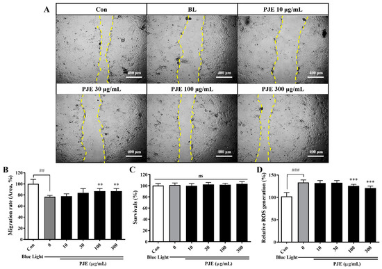 PJE is an herbal extract that was used in our previous study as a medicinal candidate for delayed corneal abrasion recovery after particulate matter exposure [31]. According to known mechanisms and our previous results, PJE was expected to have protective effects against blue light hazards. Our preliminary experiments established that the application of 1200 lux of blue light is appropriate to delay HCEC migration and increase their production of ROS (Figure 2). HCEC migration decreased to 76.8% (p < 0.01) after blue light irradiation compared with the migration of nonirradiated normal cells. PJE-treated cells showed improved migratory activities in a dose-dependent manner under blue light exposure, reaching almost 87% (p < 0.01) at both 100 and 300 ng/mL (Figure 2A,B). Cell survival was not affected at any of the indicated concentrations of PJE (Figure 2C). Intracellular ROS levels were significantly increased to 133% (p < 0.001) by blue light irradiation, but they were significantly reduced (p < 0.001) by 100 and 300 ng/mL PJE treatment (Figure 2D).