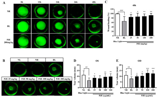 Effect of PJE on rat corneal wound healing under blue light irradiation. Different concentrations of PJE were administered for 5 days, and 4 mm wounds were generated on the right corneas of the rats. The rats were irradiated with blue light during wound healing, and images were obtained at 0, 8, 16, 24, 36, and 48 h with fluorescein staining. (A) Corneal fluorescein staining images of the NR, BL, and 200 mg/kg PJE groups during wound healing. (B) Representative images of each group at 48 h. (C) Relative wound healing areas were calculated and are presented as the means ± SDs. Tear volumes in the (D) OS and (E) OD are presented as the means ± SDs. ## p < 0.01, ### p < 0.001 compared to NR; * p < 0.05, ** p < 0.01, *** p < 0.001 compared to BL.