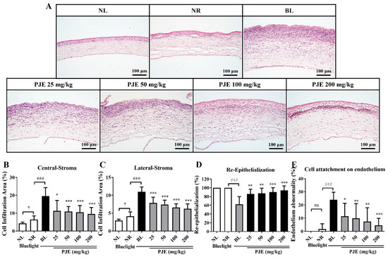 Histological changes during corneal wound healing after treatment with PJE under blue light irradiation. (A) Representative hematoxylin and eosin (H&E)-stained images of corneas at 48 h acquired at 200× magnification. Inflammatory cell infiltration in the (B) central stroma and (C) lateral stroma and (D) the re-epithelialization rate and (E) cell attachment on endothelium. Data are presented as the means ± SDs. † p < 0.05 compared to NL; ### p < 0.001 compared to NR; * p < 0.05, ** p < 0.01, *** p < 0.001 compared to BL; ns, not significant.