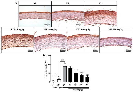Immunohistochemical analysis of IL-6 expression during corneal wound healing after treatment with PJE under blue light irradiation. (A) Representative immunohistochemical staining images for IL-6 in corneas at 48 h acquired at 200× magnification. (B) The intensities of the stained areas were calculated, and the data are presented as the means ± SDs. † p < 0.05 compared to NL; ### p < 0.001 compared to NR; *** p < 0.001 compared to BL.