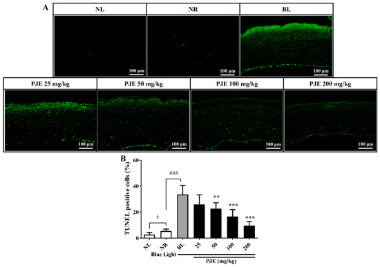 Apoptotic cells were rarely detected in the NR group, but they were markedly increased by blue light irradiation and mainly distributed in the subsuperficial region of the stroma, similar to IL-6-positive regions (Figure 7A). The NR group showed a 5.5% TUNEL-positive area, but in the BL group, this area increased to 33.6% (p < 0.001). Moreover, the TUNEL-positive area was reduced to 9.6% (p < 0.001) by 200 mg/kg PJE treatment (Figure 7B).