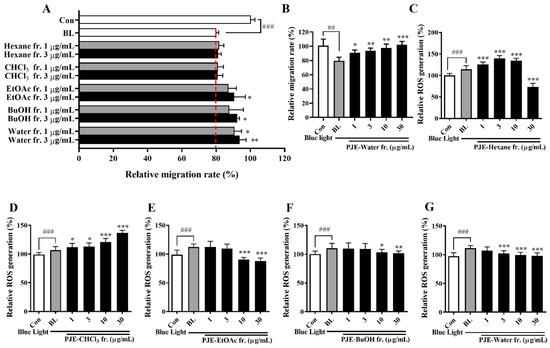 Solvent fractionation of PJE and the effects of these fractions on wound healing and ROS generation in HCECs irradiated with blue light. (A) The effect of each fraction on the relative migration rates of HCECs was calculated, and the data from the representative concentrations of 1 μg/mL and 3 μg/mL are presented as the means ± SDs. (B) The migration rates of cells treated with the water fraction as representative data are presented for all tested concentrations. Relative intracellular ROS generation after treatment with the (C) hexane, (D) CHCl3, (E) EtOAc, (F) BuOH, and (G) water fractions. Data are presented as the means ± SDs. ## p < 0.01, ### p < 0.001 compared to Con; * p < 0.05, ** p < 0.01, *** p < 0.001 compared to BL.