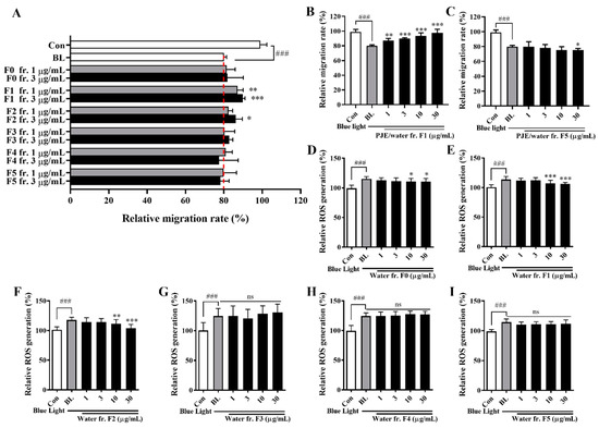 HP-20 open column chromatography of PJE/W and the effects of these fractions on both wound healing and ROS generation in HCECs under blue light exposure. (A) The effect of each fraction on the relative migration rates of HCECs was calculated, and the data from the representative concentrations of 1 μg/mL and 3 μg/mL are presented as the means ± SDs. (B) Cell migration rates after treatment with (B) F1 and (C) F5 at all tested concentrations. Relative intracellular ROS generation after treatment with (D) F0, (E) F1, (F) F2, (G) F3, (H) F4, and (I) F5. The data are presented as the means ± SDs. ### p < 0.001 compared to Con; * p < 0.05, ** p < 0.01, *** p < 0.001 compared to BL; ns, not significant.