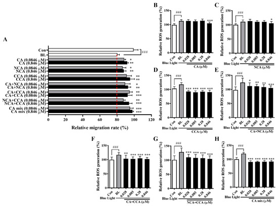 Effects of the major compounds in PJE on the wound healing and ROS generation in HCECs under blue light irradiation. (A) The effect of each molecule and their mixtures on the relative migration rates of HCECs was calculated, and the data from the representative concentrations of 0.0846 μM and 0.846 μM are presented as the means ± SDs. Relative intracellular ROS generation after treatment with (B) CA, (C) NCA, (D) CCA, (E) CA + NCA, (F) CA + CCA, (G) NCA + CCA, and (H) the mixture of all three CAs. Data are presented as the means ± SDs. ### p < 0.001 compared to Con; * p < 0.05, ** p < 0.01, *** p < 0.001 compared to BL.