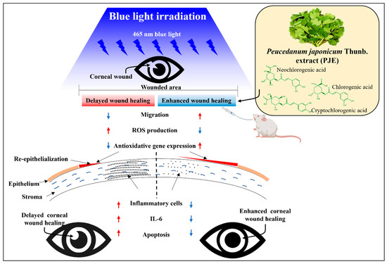 Summary of the effects of PJE on corneal wound healing under blue light irradiation. Oral administration of PJE restored delayed corneal wound healing under blue light irradiation by increasing cell migration and antioxidant gene expression levels, decreasing ROS production in epithelial cells and reducing inflammatory cell infiltration, IL-6 expression levels, and apoptosis in the stromal region of the cornea.