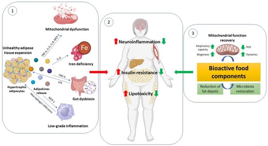 In this review, we pointed out the multi-tissue crosstalk starting from the unhealthy expansion of adipose tissue as the mechanism behind the progression of obesity-related disorders such as diabetes, metabolic syndrome, cardiovascular disease, and neuroinflammation. Identifying and understanding the specific mechanisms that are altered in this scenario (mitochondrial dysfunction, iron deficiency, and intestinal dysbiosis) would provide useful targets for developing new treatments against these impairments. The bioactive food components reported in this review could be examples confirming that appropriate healthy dietary patterns represent the primary strategy to counteract metabolic alterations (Figure 1).
