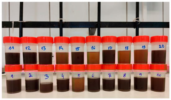 For extraction at maximum microwave power (800 W), the intermittent mode was used for treating the pomace samples (10 s on, then 20 s off), with cooling between using iced water, which was found to be an effective method for the reduction of problems caused by direct microwave exposure [34]. This mode was optional for a shorter exposure period (30 s and 105 s) and with lower power modes (100 W and 450 W), since evaporation did not appear during testing. After microwave extraction, the extracts were filtered with a fine mesh sieve, poured into test tubes, and stored in a freezer until measurements (Figure 1). Before spectrophotometric analysis, the obtained extracts were centrifuged using a Z 206 A centrifuge for 10 min at 6000 rpm to remove the suspended solids from the sample.