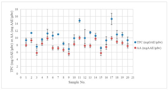 There was a significant positive relationship between TPC and AA (r (18) = 0.812, p < 0.001), where r relates to Pearson’s coefficient. The findings thus demonstrate a considerable positive correlation between the antioxidant activity of the extracted polyphenols and their quantity. As a result, AA will increase proportionately to the amount of TPC in the sample (Figure 2).