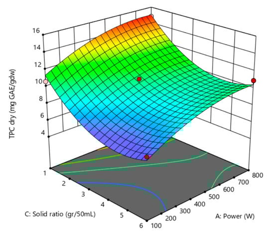 Equation (4) represents the model’s equation, corresponding to a reduced quadratic model, with no significant interaction between variables. The correlation coefficient of this model was R2 = 0.886. A graphical representation of this model is presented in Figure 3, in which the characteristic curved shape can be seen at the end parts of the response surface graph showing the relationship between total polyphenol content (TPC) and the independent variables—power (W) and solid ratio (mg GA/gdw). This suggests that the TPC’s response to changing the independent variables was not continuous across the entire range of values.