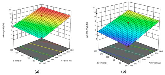 Surface response for AA, presented with time (s) and power (W), with (a) minimum solid ratio (1 g/50 mL) and (b) maximum solid ratio (6 g/50 mL).