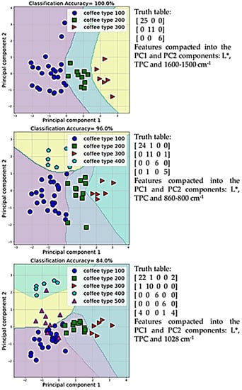 Discriminant analysis was achieved by applying machine learning algorithms to color parameters, spectrophotometric results, and FTIR spectra band intensities for defining the more appropriate feature combinations in order to confirm the discrimination of coffee sample categories. Figure 1 presents indicative PCA (Principal Component Analysis) scatter diagrams, highlighting the successful classification of coffee blend categories. The first diagram shows the optimal classification of the coffee categories of different roasting degrees, with a 100.0% overall discrimination accuracy, based on the features L* (lightness), TPC (total phenolic content), and the intensity of the FTIR band at 1600–1500 cm−1. The second diagram presents the best classification of all coffee categories (except aroma blends), and the third is the best classification of all coffee categories. The overall accuracy of predicting the coffee categories, except for aroma blends, was 96.0%, whereas the accuracy of all coffee categories classification was 84.0%.