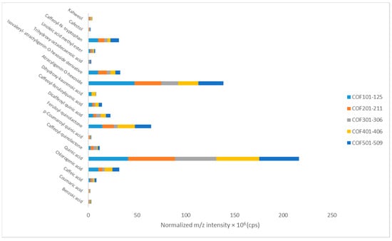 Benzoic acid, caffeic acid, and chlorogenic acid were the phenolic acids detected in all coffee samples regardless of their roasting process, their variety, or their type (decaffeinated, flavor, origin, etc.). However, only the mean contents of chlorogenic acid showed significant differences (p ≤ 0.05), as they were significantly lower as the degree of roasting increased (Group 2 and 3, medium and black roasted coffees, Table 1). Quinic acid, along with caffeic acid, which are considered key coffee metabolites since they are products of chlorogenic acids reactions during roasting, presented the highest content among all the elucidated metabolites in coffee samples (Figure 2).