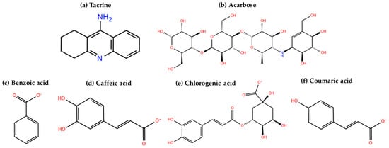 The characteristic phenolic acids of coffee samples determined through the developed LC-ESI(−)-MS/MS in-house library, including benzoic acid, caffeic acid, chlorogenic acid, and coumaric acid (Figure 3), were subjected to molecular docking studies in an effort to investigate their potential inhibitory affinity against human acetylcholinesterase (PDB ID: 7XN1) and human alpha-glucosidase enzymes (PDB ID: 2QMJ). It is noted that the presence of the aforementioned phenolic compounds in coffee samples was also confirmed by recent literature data [16,18]. The molecular target selection was based on the fact that they constitute well-established anti-Alzheimer’s and anti-diabetic targets, respectively [16,53].