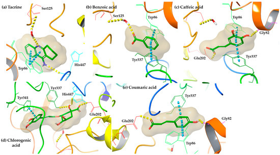 Concerning the human acetylcholinesterase enzyme, all tested compounds present reasonable docking score values compared to the co-crystallized inhibitor tacrine (Table 7). However, their docking poses indicated a fruitful interaction pattern, containing similar tacrine interactions (Figure 4). Particularly, the aromatic ring of benzoic acid interacts via a pi–pi stacking with Trp86, like the co-crystallized ligand and Tyr337. Moreover, a water-bridged hydrogen bond is formed with Ser125 as the co-crystallized inhibitor. In the case of caffeic acid and coumaric acid, a similar benzoic acid interaction pattern is illustrated, containing π-π interactions with Trp86 and Tyr337. Additionally, caffeic and coumaric acid also forms hydrogen bonds with Glu202 and Gly82, which further stabilize the binding affinity; docking poses indicated the formation of hydrogen bonds with Glu202, His447, and Tyr337 and a π-π stacking with Tyr341. It is critical to note that the described interactions are in accordance with the results of a recent publication [16].