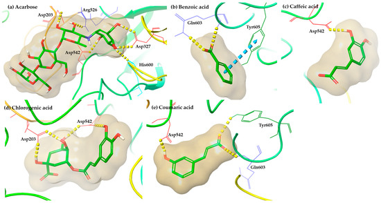 In general, molecular docking analysis results at the binding site of human alpha-glucosidase enzyme (PDB ID: 2QMJ) revealed that among the examined phenolic acids, chlorogenic and coumaric acid possess the most stable interaction pattern and may contribute to the exploration of novel alpha-glucosidase inhibitors. Chlorogenic and coumaric acid display acceptable binding energy values compared to the co-crystallized inhibitor, acarbose (Table 7), and their visual inspection pointed out a variety of interactions similar to acarbose (Figure 5). Especially, chlorogenic acid creates hydrogen bonds with Asp203 and Asp542, simulating the binding mode of acarbose. In continuation, the binding mode analysis of coumaric acid showed the formation of direct hydrogen bonds with Asp542, as acarbose, Gln603, Tyr605, and a π-π interaction with Phe575. Finally, the binding poses evaluation indicated that benzoic and caffeic acid present a reduced binding affinity into the binding site of human alpha-glucosidase. Particularly, the interaction motif of benzoic acid includes the development of a hydrogen bond with Gln603 and a π-π stacking with Tyr605, amino acids that are not participating in the binding of acarbose, and in the case of caffeic acid, only a hydrogen bond with Asp542, as acarbose, is observed (Figure 5).