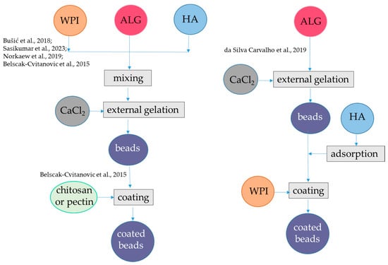 Steps to encapsulate hydrophilic antioxidants into alginate-whey protein beads. The procedures were applied to hydroxycinnamic acids from dandelion [], flavanols from blood juice [], anthocyanins from black rice [], anthocyanins from jussara [], and flavanols from green tea []. ALG, alginate; HA, hydrophilic antioxidants; WPI, whey protein isolate. The concentrations of polymers and antioxidants are indicated in Table 1.