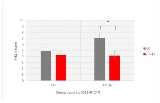 Patient Health Questionnaire-9 scores of participants with different genotypes of rs1001179 (CAT), presenting a comparison of patients with pain-related TMD and control subjects. Data are expressed as mean ± SME; * represents p < 0.05. Abbreviations: CTR, control group—absence of TMD; TMDp, TMD-pain patients—presence of pain disorders, including myalgia, arthralgia, or both; PHQ-9, Patient Health Questionnaire-9.