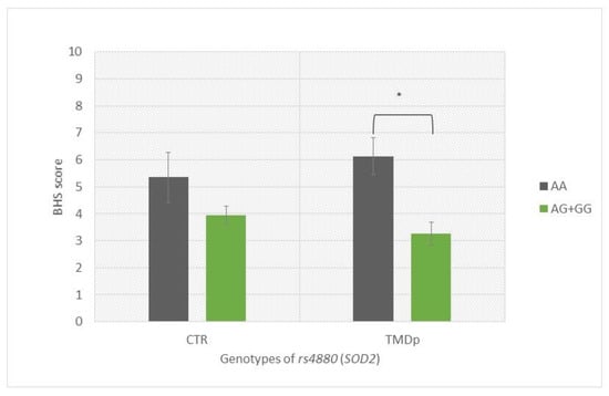 TMDp patients, AA SOD2 (rs4880) homozygotes, reported significantly higher hypervigilance scores than TMDp patients carrying the AG + GG genotypes (BHS: 6.14 vs. 3.25, p = 0.0001) (Figure 2).