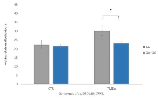 Waking-state oral behaviour scores of participants with different genotypes of rs1050450 (GPX1), presenting a comparison of patients with pain-related TMD and control subjects. Data are expressed as mean ± SME; * represents p < 0.05. Abbreviations: CTR, control group—absence of TMD; TMDp, TMD-pain patients—presence of pain disorders, including myalgia, arthralgia, or both.