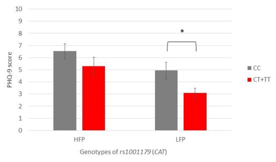 Subjects carrying the CC genotype of CAT rs1001179 polymorphism reported higher depression scores than CT + TT genotype carriers, with significant differences present only in the LFP group (PHQ-9: 4.9 vs. 3.0, p = 0.021) (Figure 4).