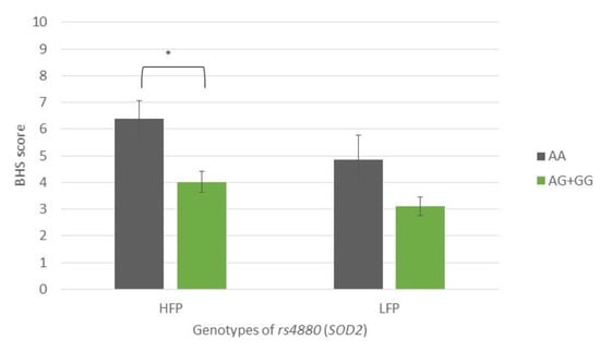 HFP subjects with the AA genotype of the SOD2 SNP rs4880 reported significantly higher hypervigilance scores than AG + GG genotype carriers (BHS: 6.4 vs. 4.0, p = 0.003) (Figure 5).