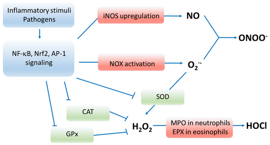 Pathways of oxidative stress. Enzymes marked in red participate in producing oxygen radicals, whereas enzymes marked in green deactivate reactive oxygen species. Inflammatory stimuli, pathogens and oxidants upregulate and activate signaling via NF-κB, Nrf2 and AP-1 transcription factors that result in enhanced production of reactive species and depressed functioning of antioxidant enzymes. Abbreviations: NF-κB—nuclear factor kappa-light-chain-enhancer of activated B cells; Nrf2—nuclear factor erythroid 2-related factor 2; AP-1—activator protein 1; iNOS—inducible nitric oxide synthase; NO—nitric oxide; NOX—nicotinamide adenine dinucleotide phosphate oxidase; O2•−—superoxide anion, ONOO−—peroxynitrite; SOD—superoxide dismutase; CAT—catalase; GPx—glutathione peroxidase; H2O2—hydrogen peroxide; MPO—myeloperoxidase; EPX—eosinophil peroxidase; HOCl—hypochlorous acid; RNS—reactive nitrogen species; RCS—reactive carbonyl species.