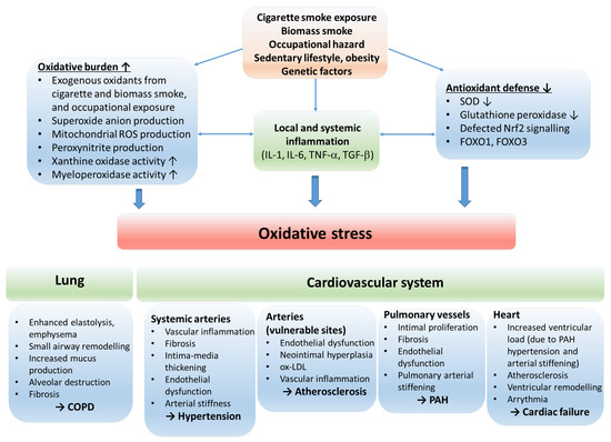 Oxidative stress driven by several environmental and local airway factors associated with chronic obstructive bronchiolitis, a hallmark feature of chronic obstructive pulmonary disease (COPD), plays a crucial role in the disease pathomechanisms [1,2]. Unbalance between oxidants and antioxidant defense mechanisms amplifies the local inflammatory processes, has systemic effects, contributes to developing COPD–related comorbidities, and worsens cardiovascular health. COPD often coexists with cardiovascular diseases (CVDs). CVDs are not only the most common comorbidities perceived in COP, but also account for an increased risk of death in COPD patients [3,4,5]. Approximately 30% of COPD patients are reported to die due to CVD. COPD and CVD share common pathophysiological mechanisms strongly related to oxidative stress [6]. This review summarizes our current understanding of the local and systemic processes that link COPD and various CVDs via oxidative stress. We focus on some relevant mechanisms that orchestrate the systemic responses leading to the parallel development of respiratory and cardiovascular dysfunctions. We aim to update and extend previous reviews related to the field by describing biomarkers, discussing the relationship between COPD and CVDs in a broader sense instead of focusing on certain specific CVDs and highlighting novel, less investigated mechanisms connecting the two disease entities via oxidative stress [4,7,8,9,10,11].