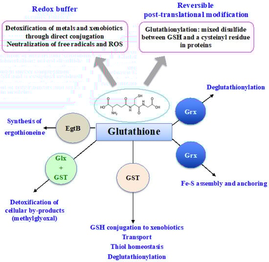 Glutathione (GSH) was discovered in 1888 by J. de Rey-Pailhade, and its composition as γ-L-glutamyl-L-cysteinyl-glycine was established much later, in 1935 [86]. That the Cys and Glu of GSH are linked through the γ-carbonyl group of Glu instead of the typical α-carboxyl group confers a high stability to GSH since only very specific enzymes under particular conditions may operate on its degradation (See below). GSH is the most abundant non-protein thiol (concentration ranging from 0.1 mM to about 20 mM) in all three kingdoms of life: Bacteria (mostly Gram-negative, rarely Gram-positive), Archaea, and Eukarya, where it plays pleiotropic roles in cell life and resistance to stresses [3,5,11,15,18,20,21,87,88,89]. GSH is a nucleophilic metabolite that directly scavenges ROS, nitric oxides and carbon radicals [3,5,11,18]. GSH also serves as electron donor to various antioxidant enzymes, including glutaredoxins, glutathione peroxidases and glutathione-S-transferases (See below). Furthermore, GSH can also act in the synthesis of ergothioneine, another antioxidant catalyzed by the EgtB enzyme (See below). In addition, the cysteinyl thiols of GSH can complex metal [3,15,20], as shown in Figure 3.