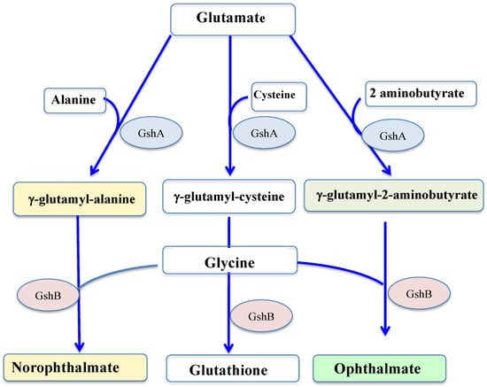 Returning to glutathione, some of its homologs have no cysteine residue, and therefore no reducing properties, such as ophthalmate (L-γ-glutamyl-L-α-aminobutyryl-L-glycine) and norophthalmate (L-γ-glutamyl-L-alanyl-L-glycine). Ophthalmate (hereafter OPH) and norophthalmate (NOPH) were initially discovered in various animal organs (lens, brain and liver) [144,145], where they are regarded as biomarkers of GSH depletion elicited by oxidative stress [146,147]. OPH was also found to have accumulated in stressed plants [148], yeasts [149], bacteria (E. coli) [150] and cyanobacteria (Synechocystis PCC 6803) [61]. Like GSH, both OPH and NOPH are synthesized by the GshA and GshB enzymes [61,146,147,148,149], as seen in Figure 4.