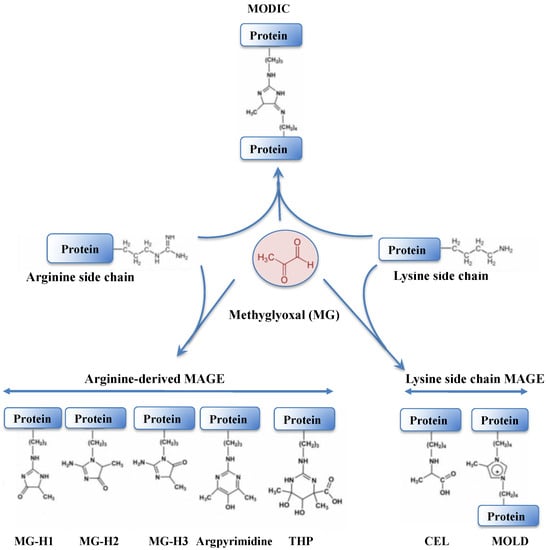Methylglyoxal (MG) is a very dangerous dicarbonyl compound that strongly interacts with lipids, nucleic acids and the arginine and lysine residues of proteins (Figure 7), generating advanced glycation end products (AGEs) that disturb cell metabolism in prokaryotes [230,231] and eukaryotes [230,232,233].