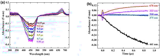 During the first μs, the absorbance at 678 nm and the bleaching at 441 nm both increase with a constant ratio because they belong to the same radical spectrum (Figure 2b). In contrast, within 1 and 420 μs, the absorbance at 678 nm decays to zero, whereas the 441 nm bleaching still increases, but more slowly, up to a plateau where ΔA441(420 μs) = −0.74 (Figure 5b). The kinetics at 441 nm is a convolution of decay of the radical absorbance, similar to that at 678 nm, and of an increase in a more intense radical dimer bleaching, arising by Reaction (5). Another small increase is observed in the positive 330 nm band. Note that, during the supplementary increase, the shape of the bleaching band changes with a maximum wavelength shifting from 441 nm to 460 nm. No isosbestic point is observed.