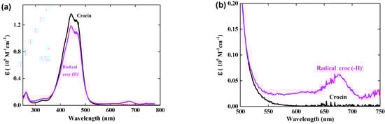 At 441 nm, the transient differential absorption spectra of the radical allows bleaching relative to the initial intense absorption band of the crocin (Figure 2a). The negative absorbance of the bleaching at 441 nm and 1 μs is almost three times higher than the positive absorbance at 678 nm (Figure 2). However, it is clearly much smaller than the expected bleaching arising from the consumed crocin corresponding to the OH• scavenging. Therefore, the radical also absorbs at around 441 nm, but less than crocin. It appears that, in addition to the supplementary band around 678 nm, the radical spectrum is very similar to that of the crocin, though less intense in the interval between the isosbestic wavelengths 375 and 510 nm (Figure 3a). A previous study had also reported the increase in bleaching at 440 nm, much less intense than expected from the OH• scavenging, and had concluded just a partial OH• scavenging, of a few percent only [15]. The simultaneous increasing absorbance arising from the radical, also at the same wavelength range as the crocin, had not been considered, and the conclusion deduced about the OH• scavenging efficiency was wrong. At 441 nm, the differential molar coefficient Δε441nm = ε441nm (croc) − ε441nm(croc (–H))• = 18,200 M−1 cm−1, that is, ε441nm(croc (–H))• = 1.17 × 105 M−1 cm−1. At 333 nm, Δε333nm = ε333nm(croc (–H))• − ε333nm (croc) = 3000 M−1 cm−1, that is, ε333nm(croc (–H))• = 0.10 × 105 M−1 cm−1 (Table 1). The complete radical spectrum is obtained from the algebraic sum of the crocin spectrum and of the differential spectrum of the radical, both calibrated in molar absorption coefficients (Figure 3).