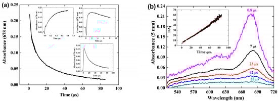 (a) Kinetics at 678 nm within 84 μs for [croc] = 0.13 mM, reconstituted according to the absorbance at 1 μs (Figure S3) and to the signals over 10 and 100 μs (insets). (b) Transient spectra within 84 μs for ([croc] = 0.13 mM. Inset: Second-order test.
