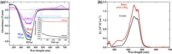 (a) Time-resolved spectra within 20 and 418 μs. The spectrum at 0.86 μs (in pink) of Figure 2a is added for comparison. Inset: Kinetics at 441 nm and 678 nm. Data before 0.86 μs are taken from Figure 2b. (b) Normalized optical absorption spectra in t molar absorption coefficient of the crocin (in black) and of the radical dimer (croc (–H))2 (in red).