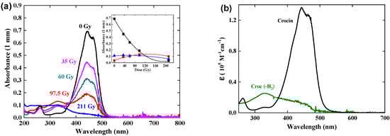 A crocin solution at 0.057 mM was gamma-irradiated at an increasing dose of up to 211 Gy (Figure 6). The main optical absorption band at 441 nm and the small band at 230 nm of the crocin decrease in intensity while keeping the same shape. Simultaneously, a new band with a maximum of 330 nm increases. An isosbestic point is seen at 375 nm up to the dose of 97 Gy. Beyond 100 Gy, the isosbestic point disappears. The dose-dependence of the absorbance at these three wavelengths is presented in Figure 6a, inset.