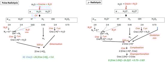Schemes of the pulse and gamma radiolysis of aqueous solutions of crocin saturated by N2O. The yield values are in 10−7 mole J−1 units.