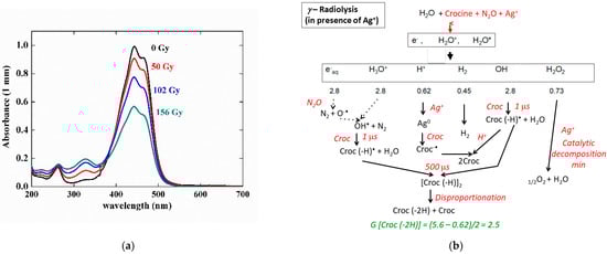 (a) Absorption spectra evolution with the γ-dose of a mixed solution of 0.084 mM of crocin and 0.1 M of silver perchlorate saturated by N2O. (b) Scheme of the radiolysis of the solutions. The yield values are in 10−7 mole J−1 units.