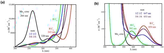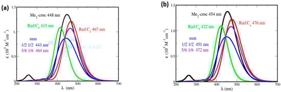 We now compare Figure 3a,b of the experimental spectrum and Figure 10 and Figure 12 of the simulated spectrum, respectively. Figure 3a shows that the oxidation product has an intense absorption band very similar to that of crocin, with a slight decrease in intensity. Figure 10a shows that the two possible products, R•Ca and R•Cb, have an intense band with very different maxima at 467 nm and 415 nm, respectively. From the large blue shift of 33 nm (0.20 eV) and the large absorption intensity decrease obtained for R•Cb alone, it appears that this radical is not predominant in contrast with R•Ca, yielding a slight decrease in intensity and a 20 nm redshift (0.10 eV). If R•Ca and R•Cb were equally formed (“½ ½” hypothesis), they would yield a larger decrease in intensity and a tiny 5 nm blue shift. Using the larger basis does not change this situation (Figure 10b).