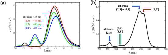 Note that the lengthy simulated, unconstraint spectrum of Figure 10a, with λmax = 448 nm is close to the constraint, all-trans spectrum of Figure 11a with λmax = 438 nm. This unconstraint simulation has been initialized with the all-trans conformer and keeps it all the time. According to the large free energies of Table S3, this is quite normal. Therefore, the present unconstrained simulation, even if extended, cannot yield the structure of the observed spectrum. The right Monte Carlo treatment of these conformation issues would be the parallel tempering Monte Carlo method [32], with several parallel, coupled MC simulations at different temperatures. However, the analysis of Section 4.3 shows that parallel tempering is not necessary and that ordinary, unconstrained MC simulations of the main conformers provide a realistic investigation of the absorption spectra.