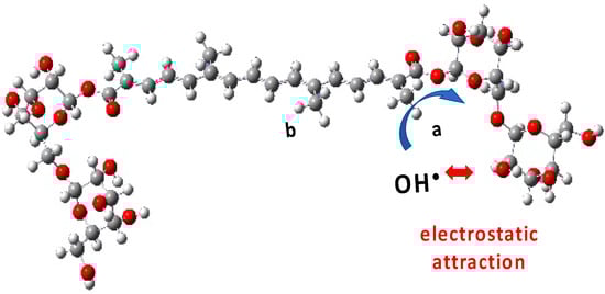 Despite the electrostatic attraction, the OH• radical cannot oxidize the sugar moieties of crocin. This sugar-driven mechanism favors the oxidation of the neighbor –CaH3, rather than –CbH3.