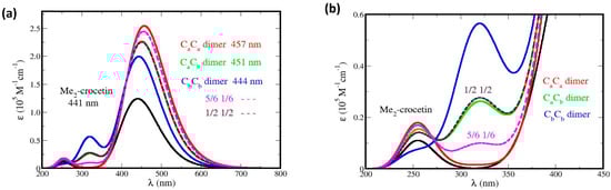 The R•Ca and R•Cb species may undergo covalent dimerization, through singlet pairing of their two unpaired electrons. In Figure 5b the dimer displays an intense band, with a slight redshift and an absorbance enhancement, with respect to crocin, and also a weaker band at 320 nm, with a ~50% absorbance enhancement with respect to the weak band of crocin at 250 nm. However, the corresponding dimers are too large for the present method of molecular simulation. We could perform simplified simulations, nevertheless, with dimers made of frozen monomers, taken in the optimized structures of the dimers, shown in Figure S14. This yields the spectra of Figure 14, where the spectrum of frozen Me2–crocetin, namely of its structure at 0 K, is added for comparison.