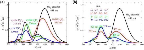 We conclude that Me2–crocetin is an adequate model of crocin. The present results for Me2–crocetin, including the interference of cis–trans conformers, emphasize the predominant influence of the polyene chain on the optical spectrum. Significantly, they may explain not only the spectrum of crocin but also the spectrum shape of β-carotene and of numerous carotenoids, mainly the same intense and dissymmetrical band [47].