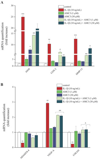 3.3. AMC3 Modulates Chondrocytic Expression Genes Involved in Inflammation and Tissue Structural Integrity Maintenance