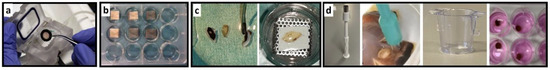 Key features of presented retina culture models. The photographs illustrate the different culture systems. (a) Minuth chamber with a retina clamped into the culture ring. (b) In the multi-well plate are pRetinae cultured on nitrocellulose membranes on customized stainless-steel grids. (c) The smaller rat retina is cut into halves before cultured on nitrocellulose membranes and customized grids. (d) The panel shows the punch, how it cuts tissue, and the culture insert before use and in use.