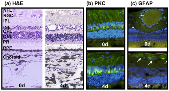 Model 1 used bovine eyes and provided us with our first insight into the feasibility of ex vivo cultured retinae, especially when cultured in conjunction with choroid and RPE layers, and inflammatory reactions. The H&E-stained sections confirmed that the tissue integrity, including the photoreceptor outer segments (POS), was maintained for 4 d (Figure 2a). Nevertheless, signs of degeneration were visible, i.e., holes and cell loss in the retinal ganglion cell (RGC) and inner nuclear (INL) layers, and the connection between the RPE and POS got lost. The protein kinase C (PKC) selectively stains bipolar cells, indicating cell loss (reduced staining) or inflammation (increased staining); in the present model, the PKC expression (green) did not decline over time (Figure 2b, bottom) compared to the sections stained directly after isolation (Figure 2b, top). The second inflammatory marker, the glial fibrillary acidic protein (GFAP), identifies “activated” Müller cells; the resulting pictures demonstrated a low, positive GFAP signal on day 4 of culture (Figure 2c, bottom) comparable to that of retinae stained directly after isolation (Figure 2c, top).