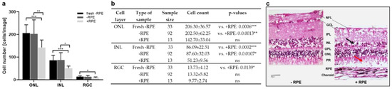 Cell counts and morphology of porcine retinae cultured with and without RPE. (a) Illustrated are cell counts in the ONL, INL, and RGC layers, determined in H&E-stained sections on day 1 from tissue samples isolated with (+RPE) and without (−RPE) RPE, compared to those of the sections directly stained after isolation without RPE (fresh −RPE). While cell counts of cultured, neural retinae were similar to freshly processed tissue, cell numbers were significantly reduced in ONL, INL, and RGC layers of cultured RPE–retina complexes. (b) Individual values, n-numbers, and p-values of cell counts in ONL, INL, and RGC layers. (c) Representative H&E-stained sections illustrate tissue degeneration in retinae cultured with/without RPE. Overall, the “+RPE” culture decreased in thickness and revealed holes and cell loss, as indicated by the black arrow in the INL and the red arrow in the POS layer. Magnification: 400×; scale bar: 50 µm. * = p < 0.05; ** = p < 0.01; *** = p < 0.001.