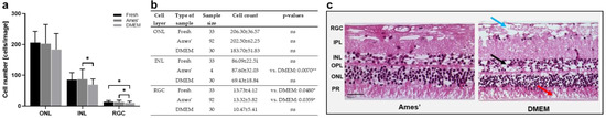 Figure 4 reports the results of a comparison of the Ames medium and DMEM in the neural retinae cultured for 1 d. In the ONL, the cell counts did not differ significantly but showed a trend of lowered cell numbers in DMEM (Figure 4a,b). In the INL and RGC layers, this difference was significant, with reduced cell counts after being cultured in DMEM. This result is supported by better tissue preservation, as shown in the H&E-stained cross sections from the retinae cultured in Ames medium (Figure 4c).
