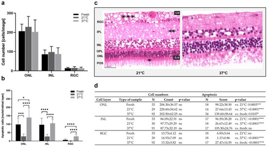 Cell counts and apoptosis in porcine retinae cultured at 37 °C vs. 21 °C. (a) Increased cell counts were detected in the ONL of retinae cultured at 21 °C for 1 d. Additionally, in the INL, highest cell counts were found in 21 °C cultures. There was no important difference in cell counts in the RGC. (b) The rate of apoptosis declined significantly in ONL, INL, and RGC layers of cultures incubated at 21 °C. (c) H&E-stained sections show representative examples of retinae cultured at 37 °C or 21 °C. Significant degeneration was seen after culture at 37 °C with holes mainly in the INL and a significant loss of tissue integrity and POS. Additionally, at 21 °C, holes were found in the NFL and IPL (asterisks) layers. (d) Individual values, n-numbers, and p-values of cell count and apoptosis analysis in ONL, INL, and RGC layers. ILM: Internal limiting membrane; ELM: external limiting membrane. Magnification: 400×; scale bar: 50 µm. * = p < 0.05; *** = p < 0.001; **** = p < 0.0001.